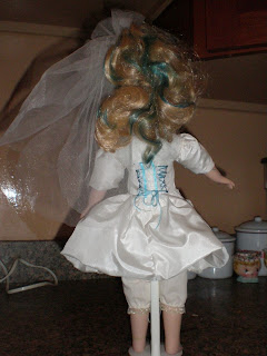 My neighbor just had a yard sale and she piled up the leftovers on the sidewalk with a "free" sign. While supervising my 10 year old son mow her lawn, I took the opportunity to dig through the discards. I rescued two strands of net lights for bushes (score!), two metal boxes which I have already began to alter into memento holders and a Victorian-style bride doll. She had seen better days. Her hair was in good shape but her stockings were yellowed; her face was dirty; and she seemed as if she had been played with instead of put on the shelf and left alone to collect dust as most dolls of this nature. Perfect for transforming into something more modern! I dyed her hair, added body jewelry and art, and completely overhauled her dress. I cut off the lace top and high collar - removed the long and puffy parts of the sleeves - added some color and fanciful decorations utilizing other found items from previous scavenging adventures.