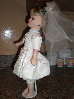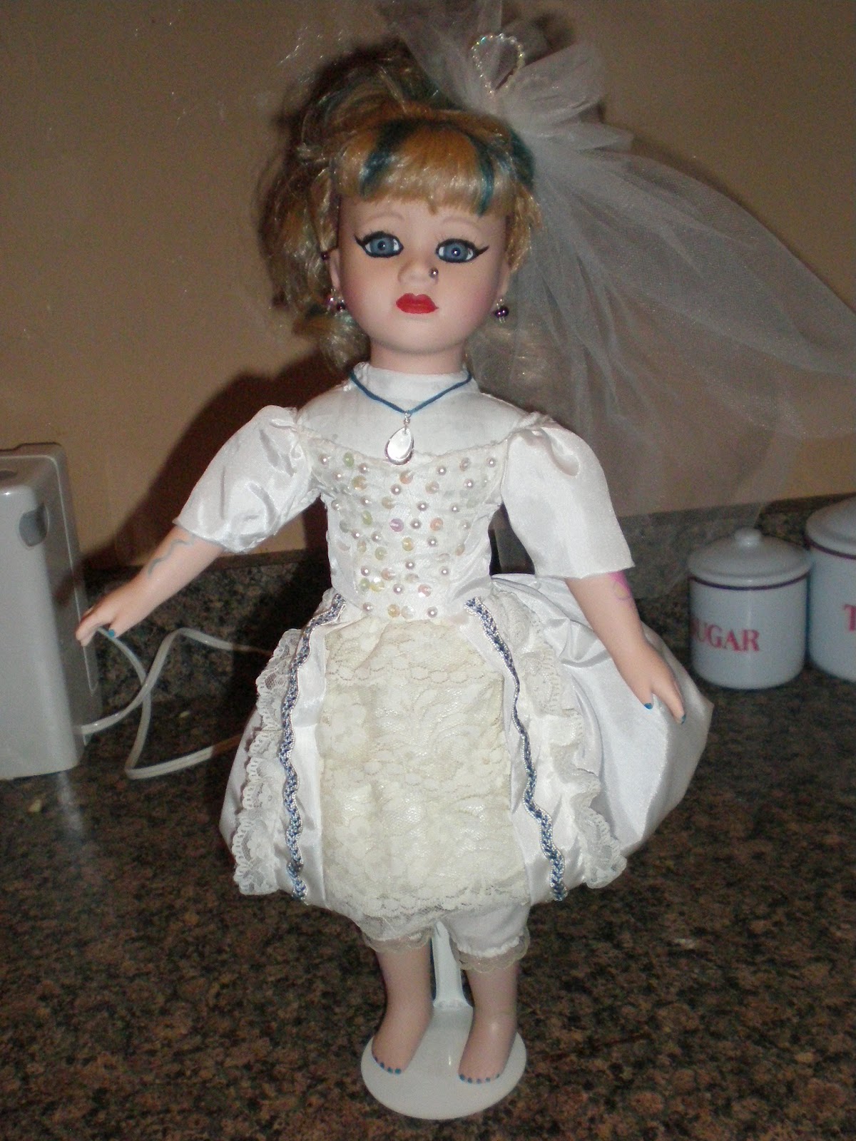 Much like Cinderella morphing from an ember-tinged housecleaning slave this poor little bride has become the envy of all dolls stuck in the much fascinated about but ultimately boring and female-oppressed era. She now resembles more of a rockabilly chick. I was going for The Cigarette Girls Burlesque-inspired look. I think it was almost achieved. I am stoked. Now, I just have to figure out what to do with her. I don't think my husband appreciates having a tattooed and pierced doll on the mantle above the fireplace.